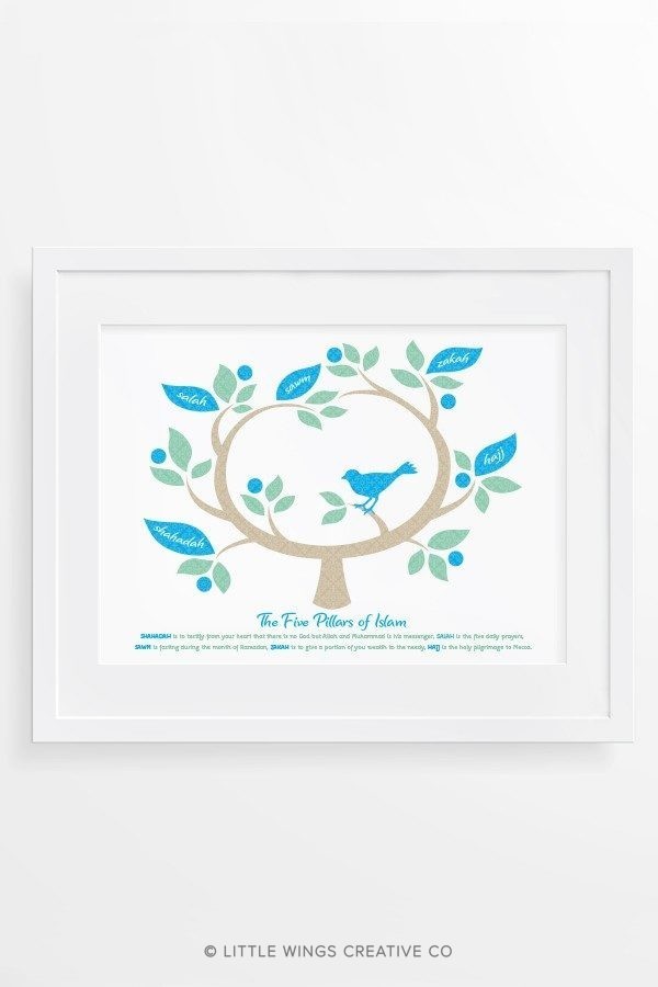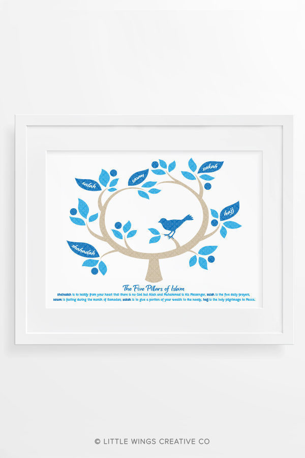 A beautifully decorative Islamic print of the Five Pillars of Islam and their meanings. A great Islamic gift idea for kids that’s educational too! Available in your choice colours.