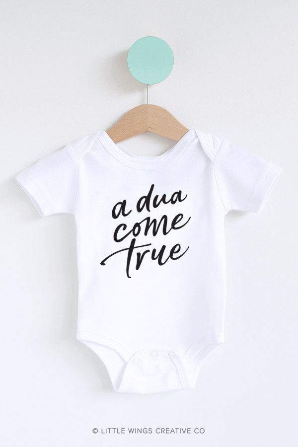 Give the perfect Islamic baby gift with our “Dua Come True” Muslim baby onesie. A beautiful way to celebrate the arrival of a little Muslim and a cute outfit choice for a baby announcement.